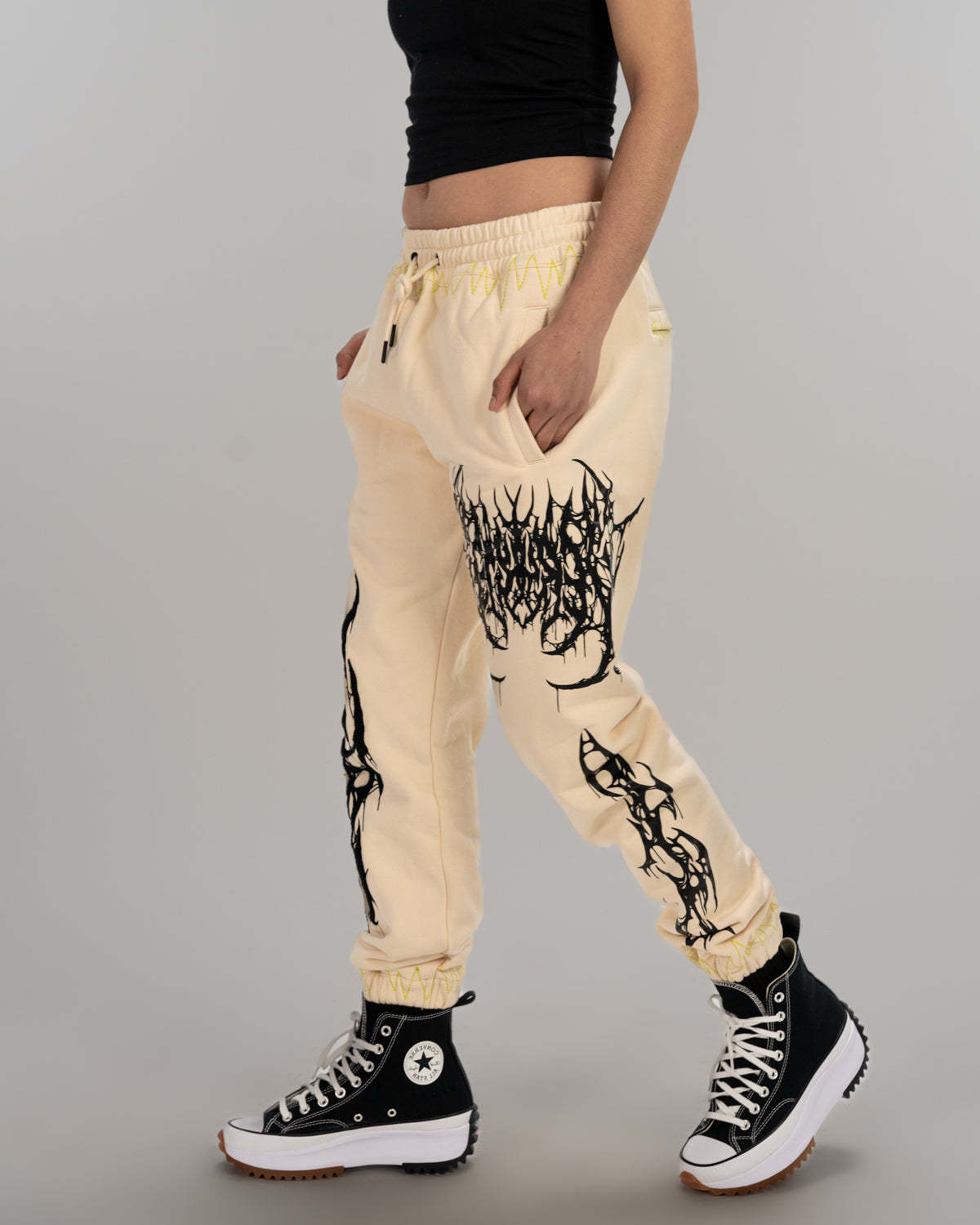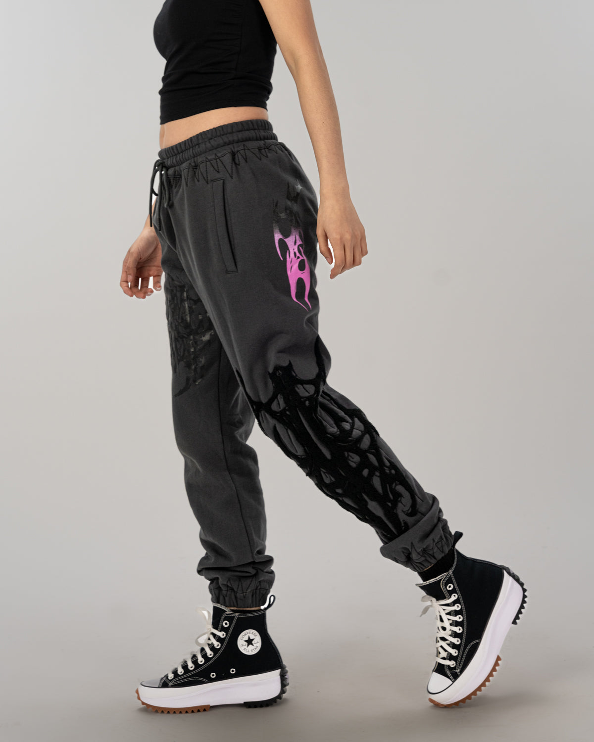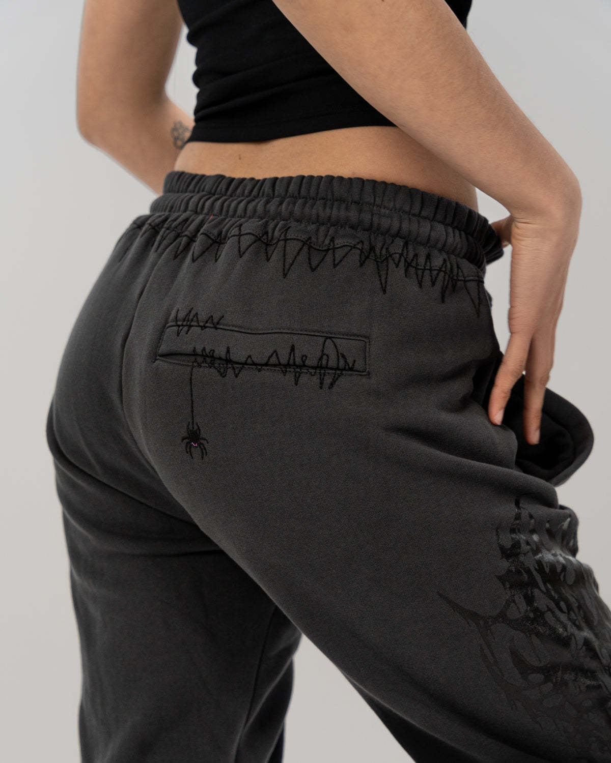 All over screen print, embroidered and tufted graphics