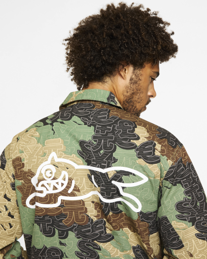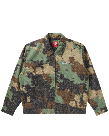 Workwear-inspired zip jacket featuring an allover camo print with tonal currency graphics and a bold Running Dog graphic across the back.