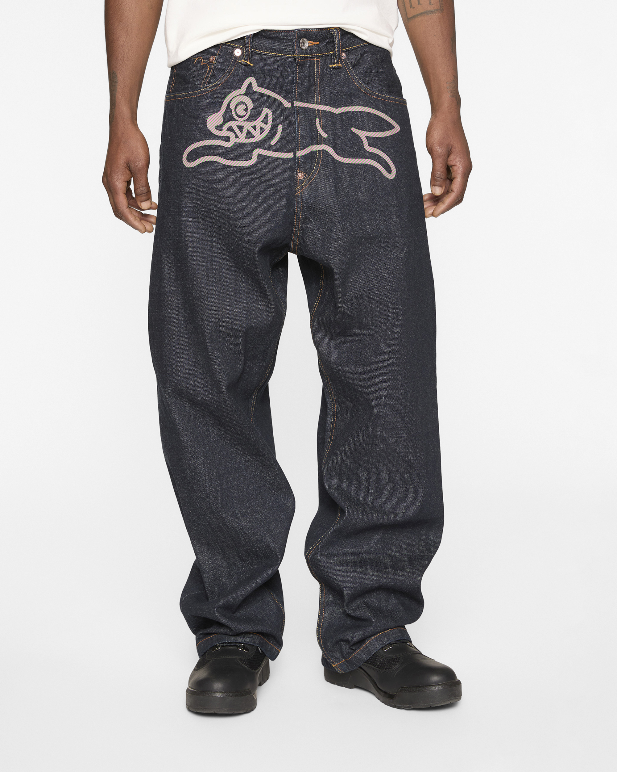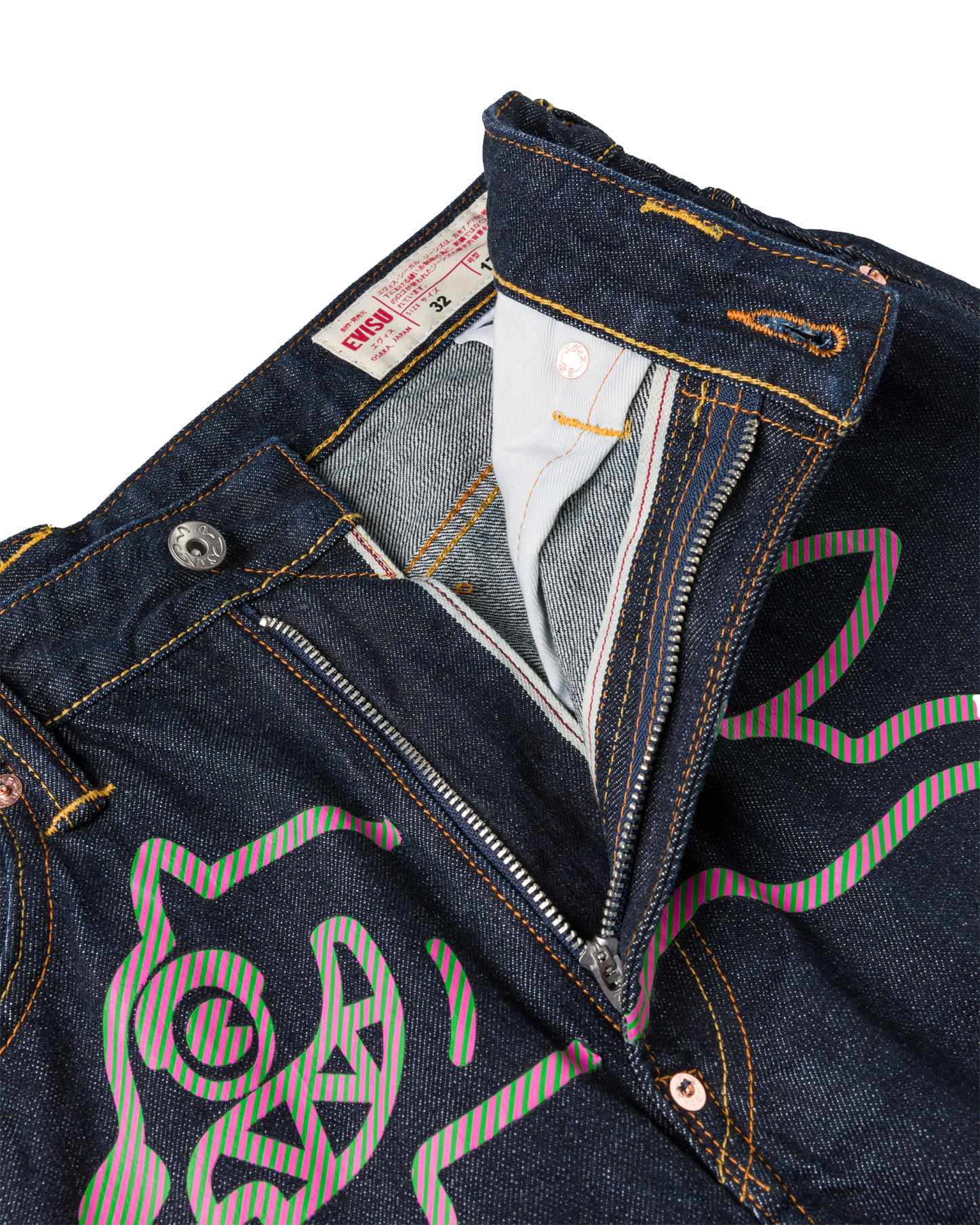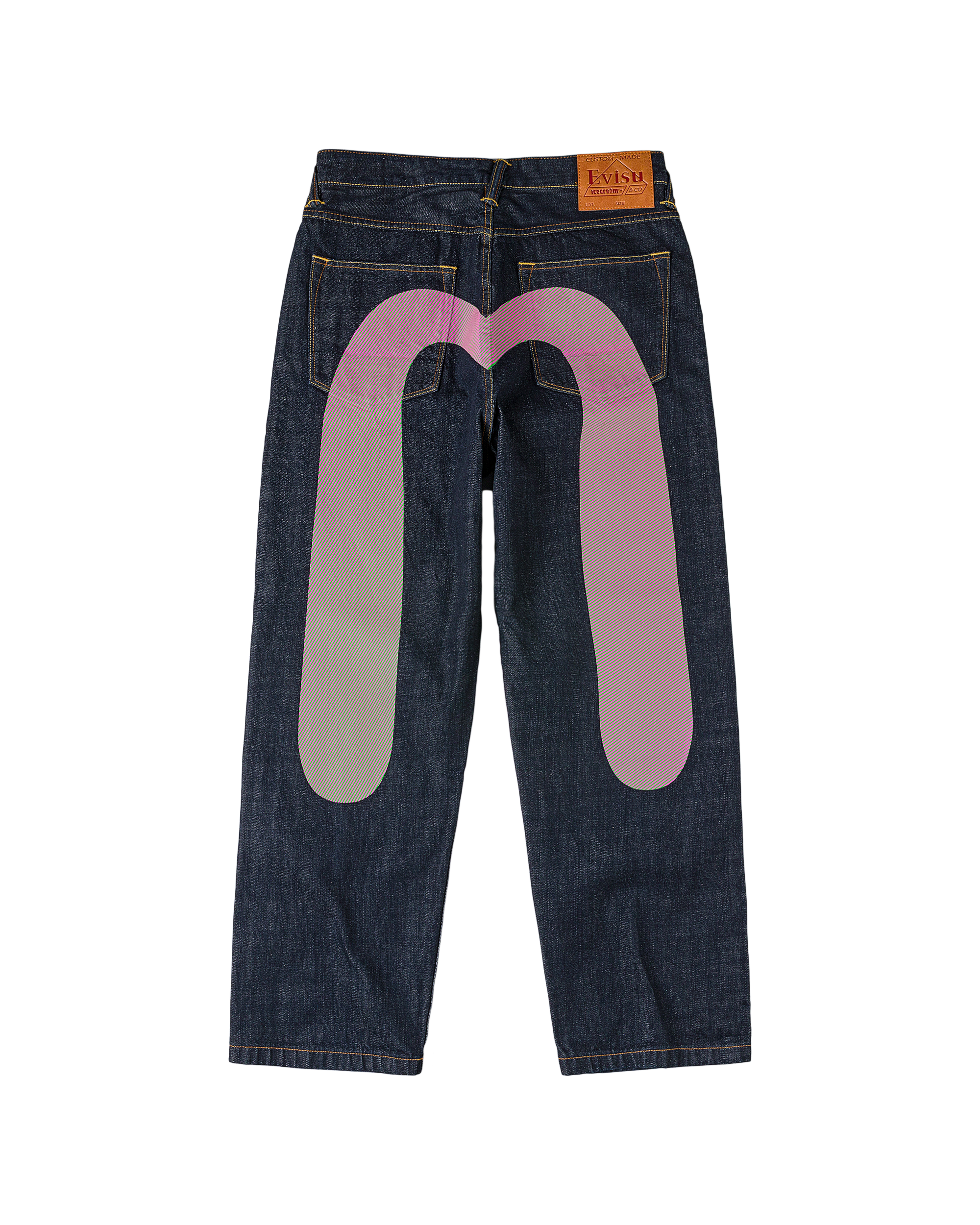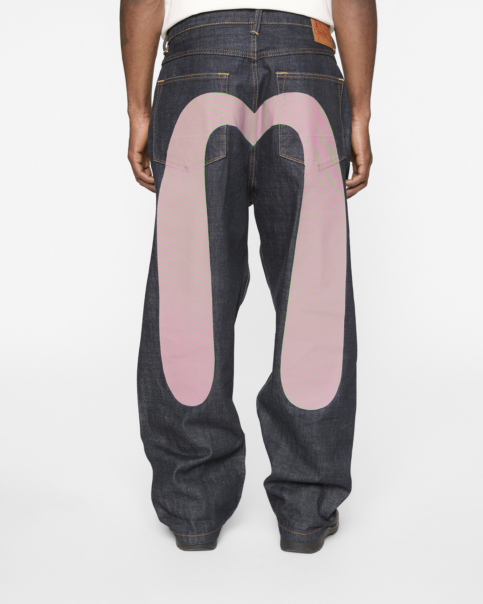 Premium selvedge denim with custom pink and green hickory stripe print Running Dog and Evisu Daicoc print across the back, blending statement graphics with everyday wearability. Crafted from 100% cotton in a loose fit for a relaxed, street-inspired silhouette.