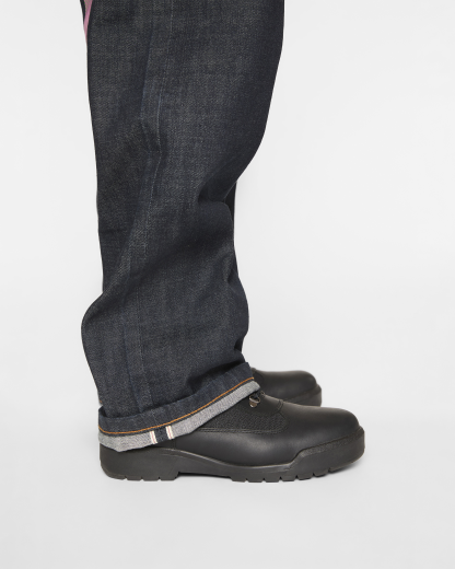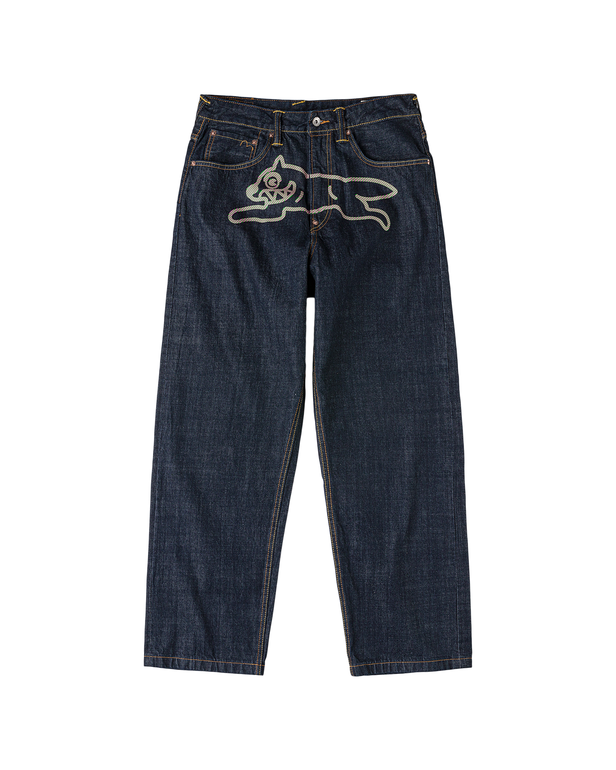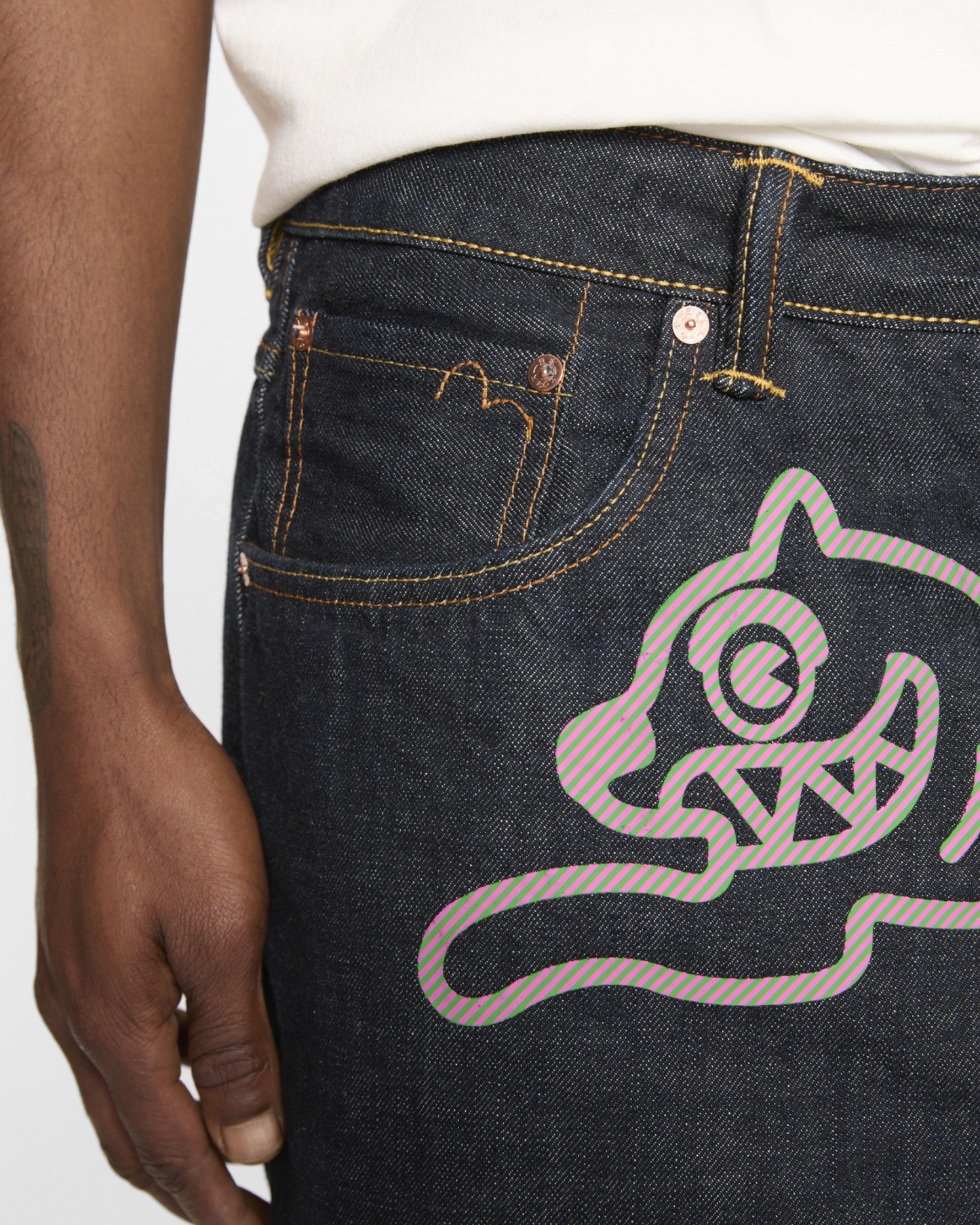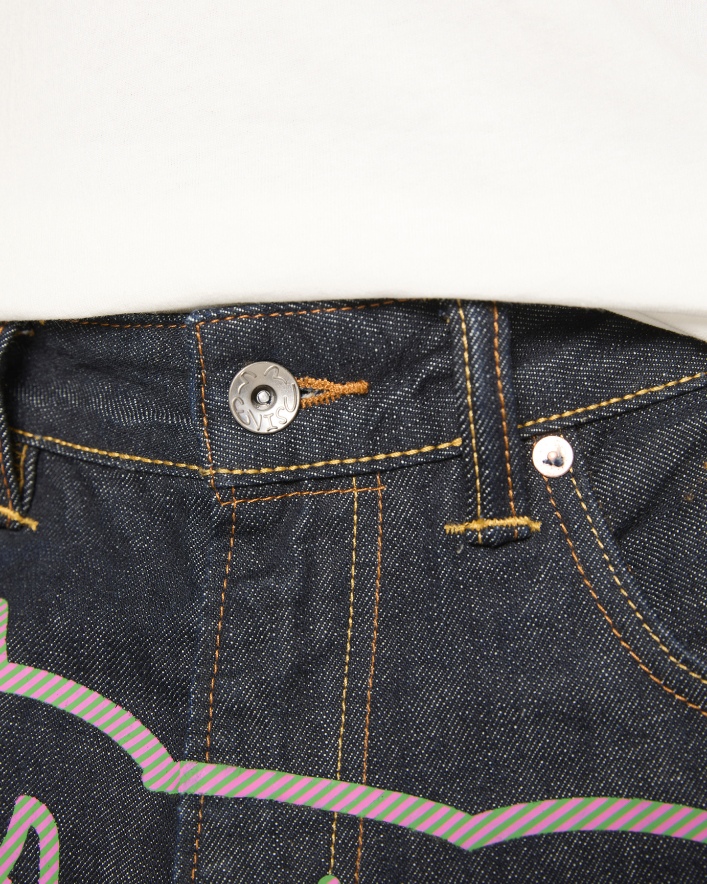 Premium selvedge denim with custom pink and green hickory stripe print Running Dog and Evisu Daicoc print across the back, blending statement graphics with everyday wearability. Crafted from 100% cotton in a loose fit for a relaxed, street-inspired silhouette.