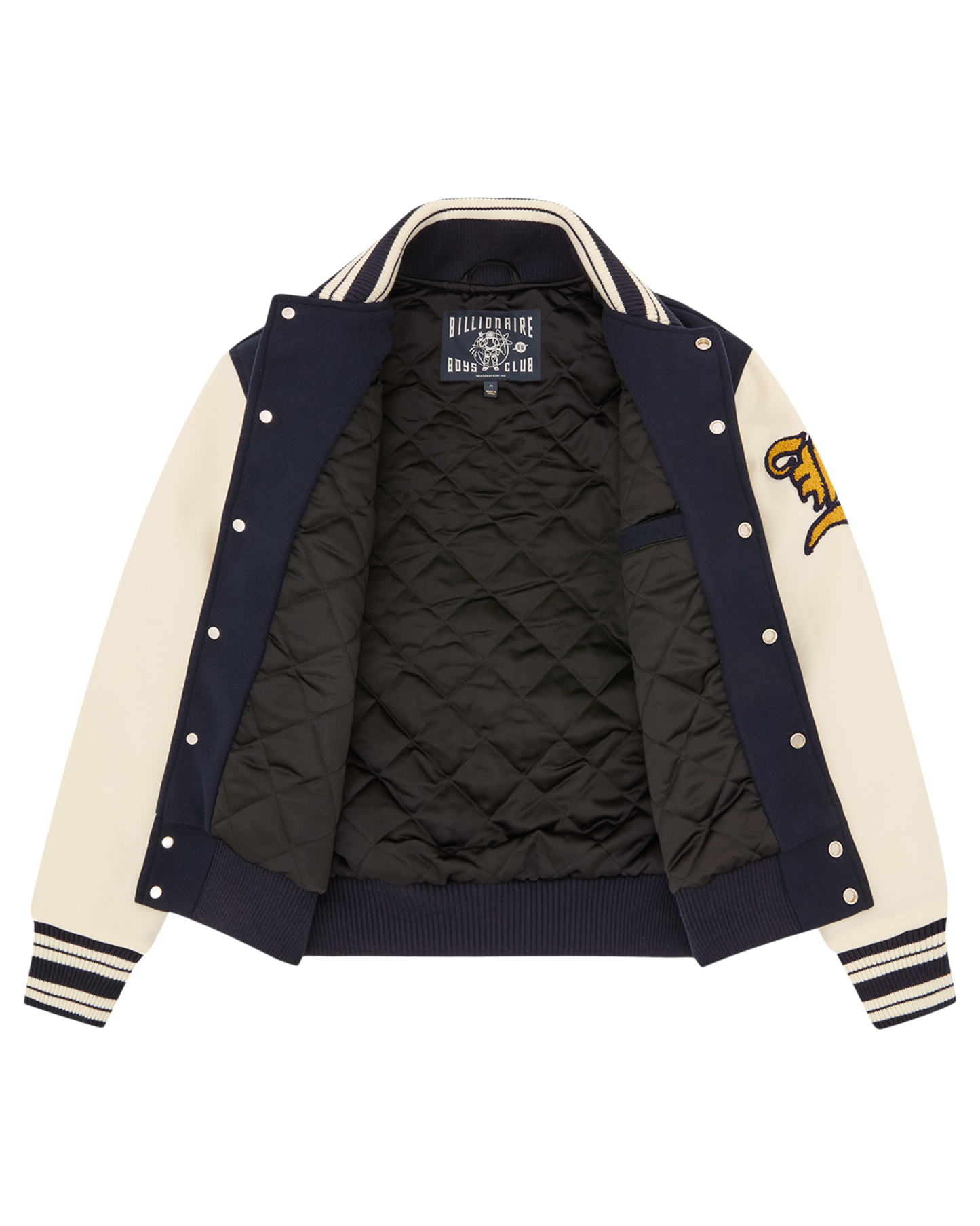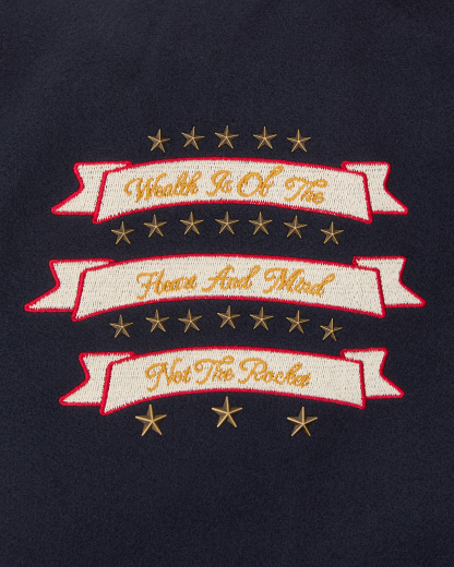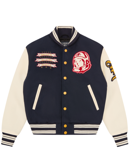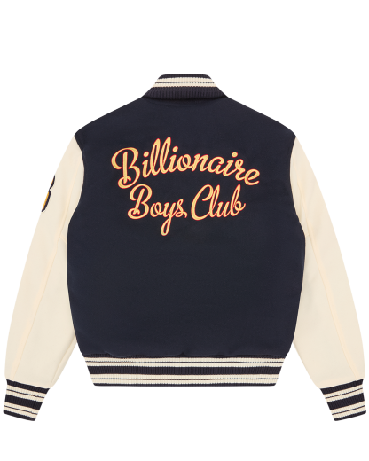 The Fanfare Script Wool Logo Varsity Jacket is shaped like a classic Billionaire Boys Club varsity jacket. It showcases signature Billionaire Boys Club appliques, including the iconic astronaut emblem and, Wealth is of the Heart and Mind‚ embroidered across the chest. It is finished with the embroidered Billionaire Boys Club Script logo on the back.