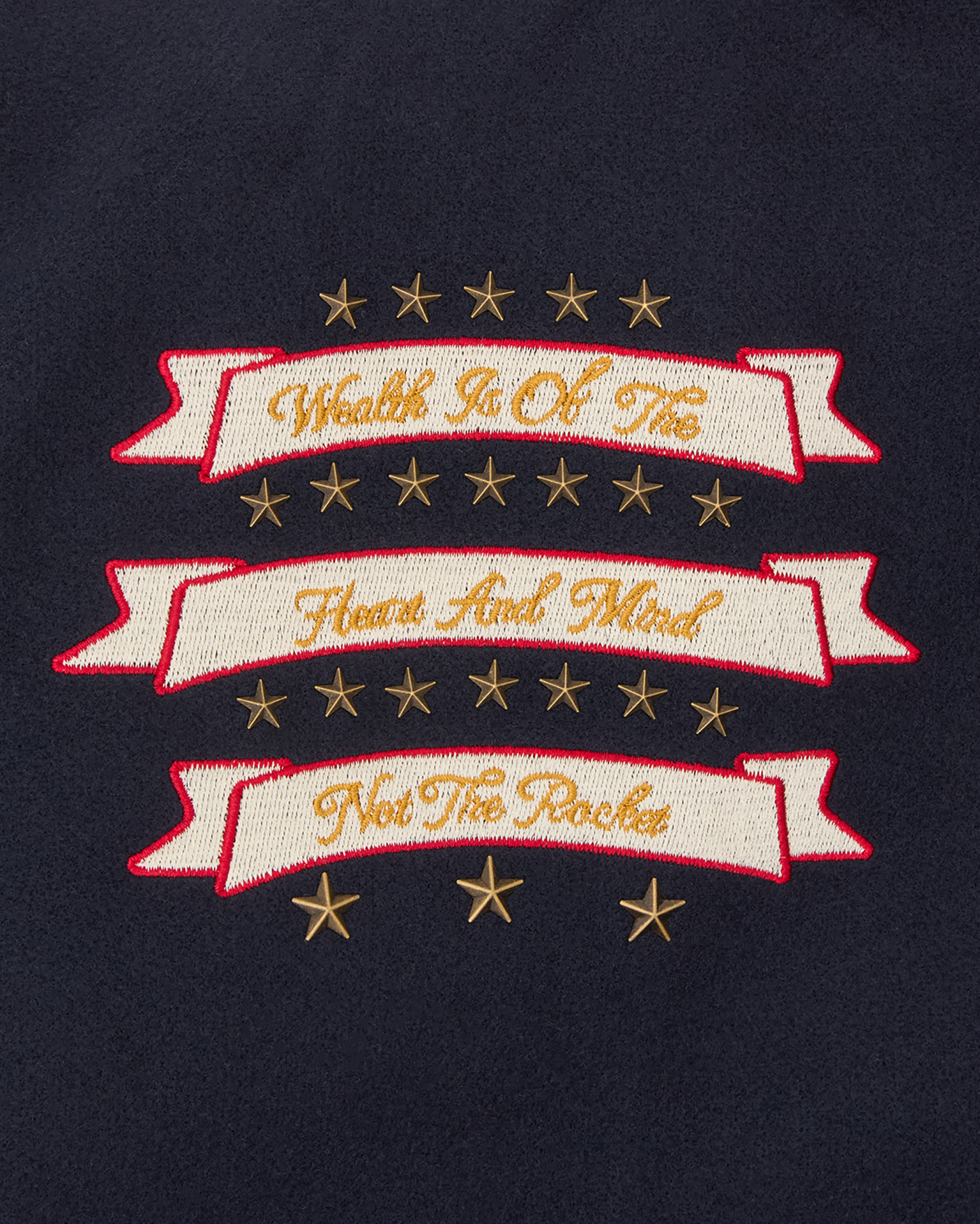 - Embroidered signature mantra with metal star shaped studs on the right chest